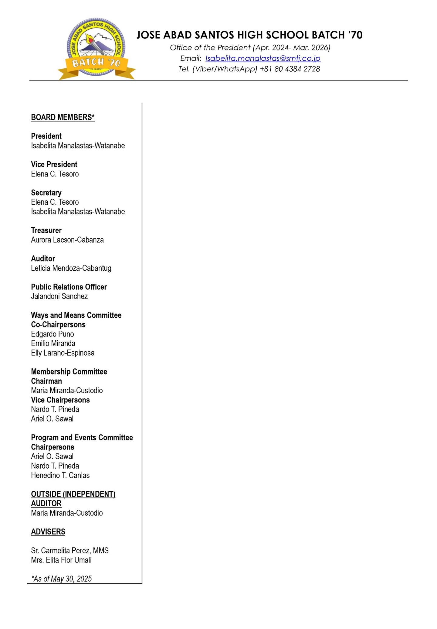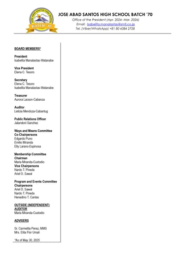 Graduates of JASHS Batch ’70 meet annually to stay connected, enjoy camaraderie, share meals and drinks, dance, and engage in Maritess-an. Supported by alumni donations, our informal association thrives without formal by-laws, overcoming challenges with dedication and love, ensuring our joyful tradition continues.